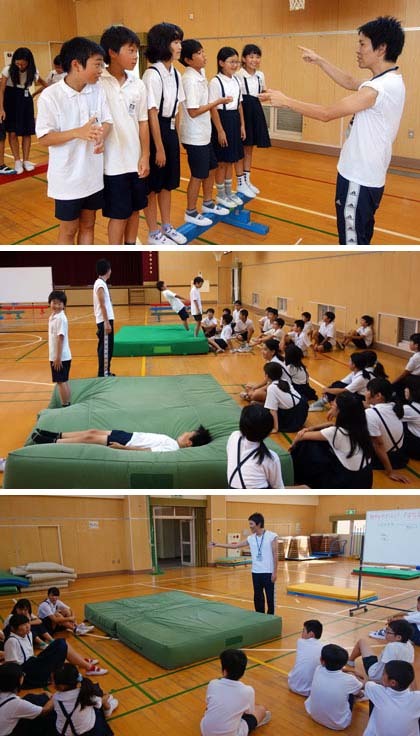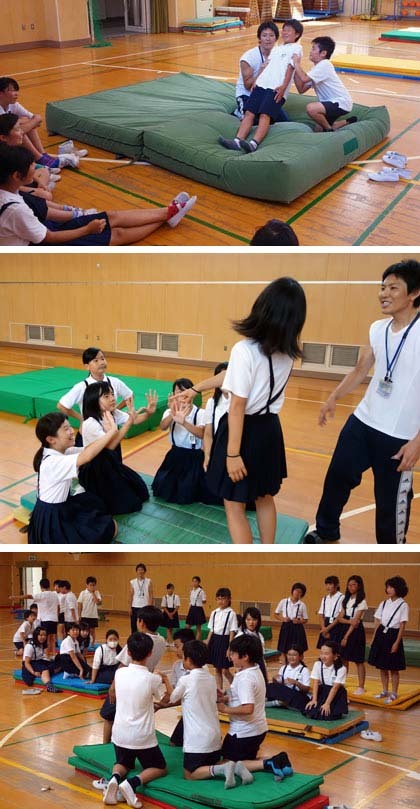 まずは、グループごとにわかれて平均台を使ったミニゲーム。緊張をときほぐし心をやわらかくしたところで、セーフティマットのところに移動。「何をするんだろう?」みんな興味津々です。