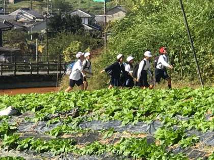 現地に到着しました。これからグループごとにオリエンテーリングを行います。のどかな田園風景が広がる中に点在する「猿石」「亀石」「鬼の雪隠・俎板」「石舞台」などを巡ります。