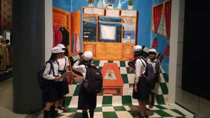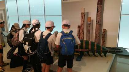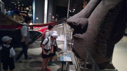 国立民族博物館、館内の見学の様子です。館内には世界各地の諸民族の生活を知ることのできる貴重な資料がたくさん展示されています。