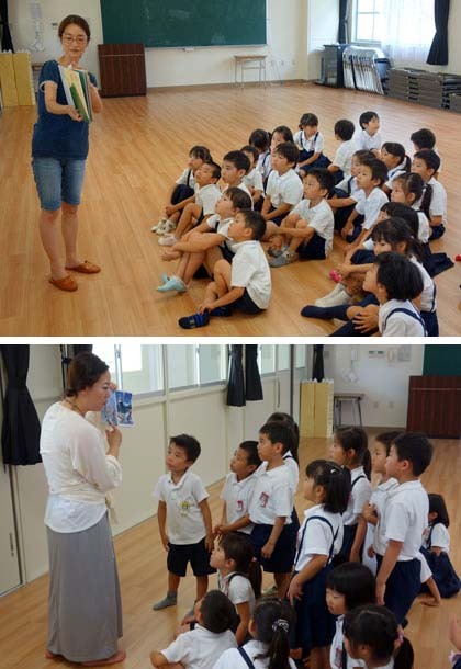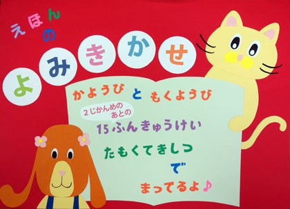 本の読み聞かせの新しい告知ポスターができました。ボランティアさんの手作りです。しかも3枚! 多目的室に1枚貼っています。あと、本校ロビー・分校ロビーにも掲示する予定です。「きくちゃん」と「みるちゃん」がデザインされたかわいいポスター、また見てくださいね。