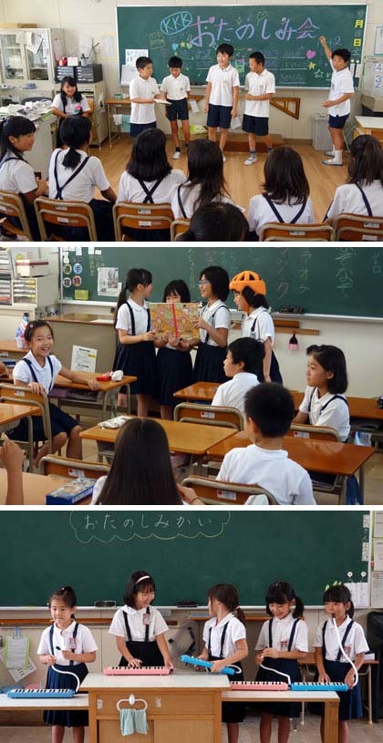 今日は、給食なしの3時間授業。たくさんのクラスがお楽しみ会をしていました。ゲーム・クイズ・手品・お笑い・寸劇・ダンス・歌・楽器演奏などなど、いろいろな出し物で盛り上がっていました。どのクラスも笑顔でいっぱい!