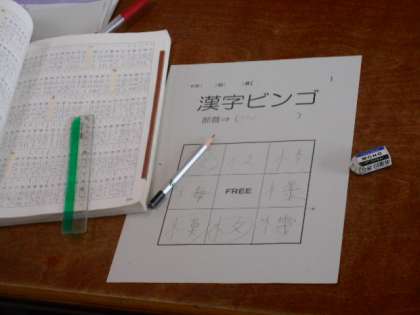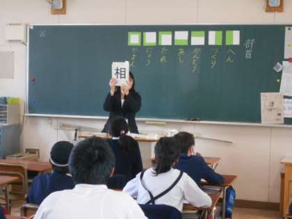 写真は5組の国語の出前授業です。漢字の成り立ち、部首などの学習をビンゴカードを用いることで楽しく学習することができました。