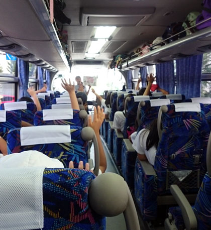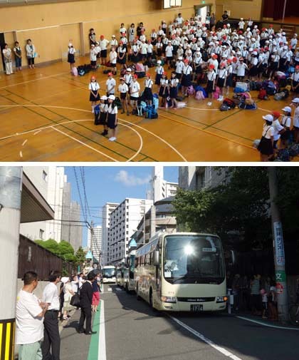 講堂で出発式を行い、バス5台で予定どおり出発しました。大きな渋滞もなく、順調に進んでいるようです。