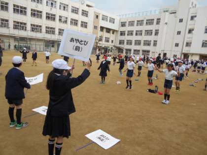 今週から、全校でなわとびに取り組む「ジャンプタイム」が始まりました!寒さも厳しくなってきましたが、ポップタイムやパワーアップタイムにみんな元気よくなわとびを跳んでいます!写真は4年生の活動の様子ですが、前にいる児童が跳ぶ種目をみんなに分かるように掲げて工夫していますね!みなさん、いっぱい運動して寒さに負けない体をつくりましょう!