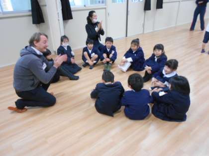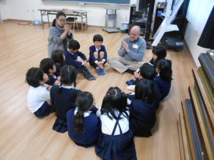 写真は1年生対象の英語レッスンの様子です。区役所主催の行事で1年生に楽しく英語にふれてもらおうとネイティブの講師の方も多数来てくださいました。