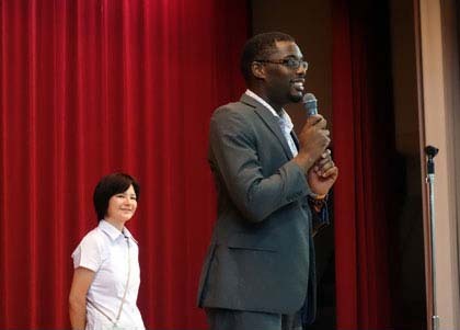 校歌、100周年記念歌を“いつもの”K先生のピアノ伴奏で元気よく歌いました。校長先生が、「夏休み中に転入生が13人来ました。常盤小学校の児童数は何人になったと思いますか? 1190人です!」と発表すると、講堂はどよめきに包まれました。