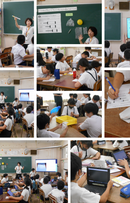 4年生の理科では「空気と水」の単元で、空気鉄砲の中の空気の様子について学習しました。動画を見たり、風船や袋などに触れて、予想をしていきます。それぞれの言葉や絵で自分の予想を表現していました。それをタブレット端末を用いてみんなで共有し意見交流をしました。次回は実際に検証をするようです。