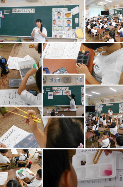 1年生の栄養指導では、お箸の持ち方を学習しました。お箸の正しい使い方について掲示物などから学習しました。その後実際にお箸を持って正しいお箸の持ち方を行いました。なかなか難しそう。その持ち方で、小さいものをつまんで移動する練習をしました。小さなスポンジは多くの子どもたちがクリア!でも大豆や小豆になると難易度がUP!それでもあきらめずに何度も挑戦していました。頑張って習得してほしいと思います。