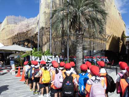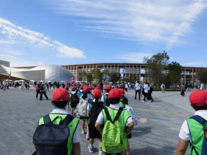 混雑の中、様々なパビリオンを回り満喫することができました。楽しみにしていたシンガポール館では、未来の世界がもっと良くなるようにという願いを込めて、各グループで考えた夢を書きました。そのあと、書いた夢が高い夜空に浮かんで広がっていく様子を子どもたちはキラキラした目で眺めていました(^^)みんなの思いがつながって、大きな力になり明るい未来がうまれますように!