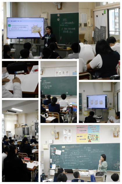 6年生の算数では、立体の体積の求め方を「底面積×高さ」で求めることができるかを考えています。底面が三角形の時、円の時。複合的な図形の時。これまで学習した内容をもとに考えていました。
