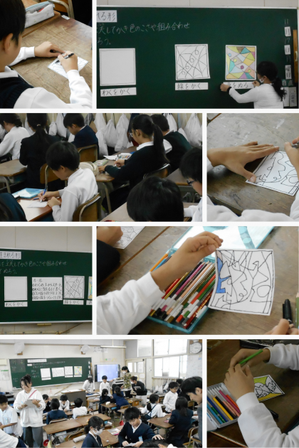 4年生の図画工作では、色々な線で模様を作り、そこでできた部屋に色合いを考えて着色していきます。どの色とどの色が隣り合うときれいか考えながら色を塗っていました。