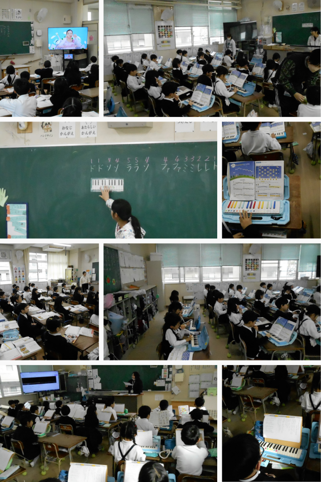 廊下を歩いていると素敵な鍵盤ハーモニカの音色が聞こえてきました。1年生の教室をのぞいてみると、鍵盤ハーモニカの練習をしていました。「きらきら星」を演奏していました。ラの音が初めてなので、指使いに気を付けながら演奏していました。とても上手に演奏できていました。隣の教室からは素敵な歌声が聞こえてきました。「きょうもあしたも1年生」という曲を練習していました。子どもたちの明るい声がとても素敵でした。その隣のクラスでは、「おおさかには うまいもんがいっぱいあるんやで~~」と歌声が。道徳の学習の中で歌を歌っていました。楽しそうに映像を真似して歌っていました。