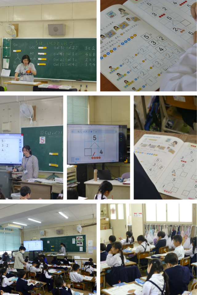 一年生の算数では、「いくつといくつ」の単元で数の合成・分解の学習を行っています。今後学習する足し算、引き算の元となる学習です。みんな一生懸命取り組んでいました。笑顔ですぐに回答していました。