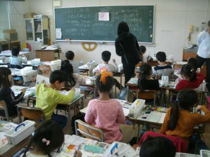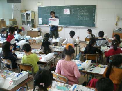 図画工作科の学習の様子です。水彩絵の具を使って学習しています。先生が子ども達の頑張っているところ・いいところを次々と見つけて、みんなに紹介しています。