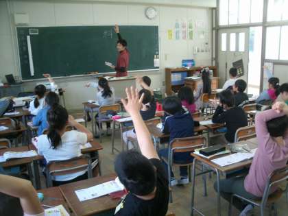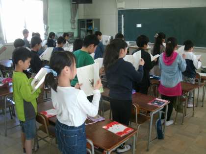 国語科の学習をしています。新出漢字「料」の学習、全員で「こわれた千の楽器」の音読をしています。