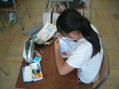 家庭科学習の様子です。運針をしています。苦戦している子どももいますが、粘り強く頑張っています。