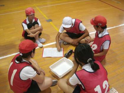 対抗ゲームが終わると、チームごとにふりかえりの話し合い活動をします。