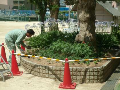 学校の校庭には花が似合います。4月は桜。チューリップやサクラソウ。5月はハナミヅキ。6月は紫陽花やアガパンサス。7月はホウセンカ・マリーゴールド・百日草・アサガオ。ミニトマトの小さな花も咲きます。アサガオやホウセンカのように子ども達が観察のために植えるものもありますが、それ以外の花は管理作業員さんが苗(バックヤードで種から育ててくださっています。)を植え付けてくださったり、樹木の手入れをしてくださったりすることで私たちの目を楽しませてくれているのです。学校には花がないといけません。学校で子ども達の「見える学力」を上げることも大切ですが、それと同様に豊かな感性を育てることも大切です。アサガオやミニトマトを育てて観察したり、学校で四季折々に咲く花を見ることは子ども達の豊かな感性を育んでいくことになります。