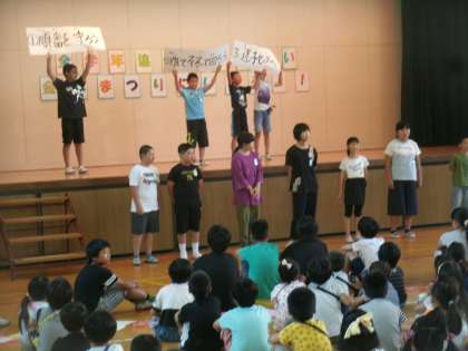 開会式の様子です。今年のめあては「全学年協力して楽しい金塚まつりにしよう」です。