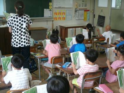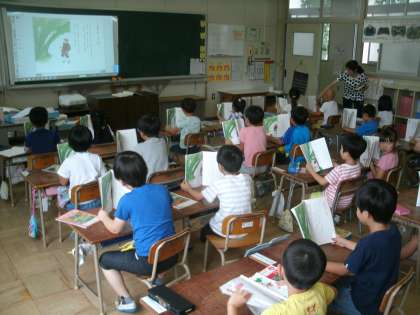国語科学習の様子です。教材文「おおきなかぶ」をみんなで声をそろえて音読しています。両手でしっかり教科書を持っているかな。しっかり声をだしているかな。