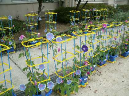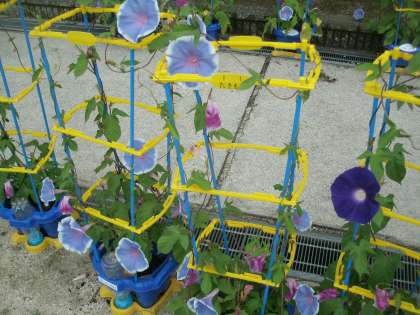 1年生の育てているアサガオが花をいっぱい咲かせています。