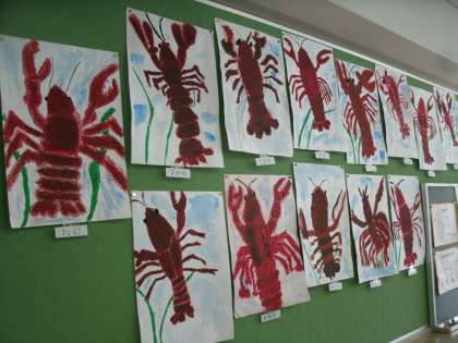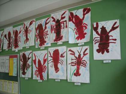 以前、ご紹介させていただいた2年生のアメリカザリガニの絵。教室に掲示されました。すごい迫力ですね。