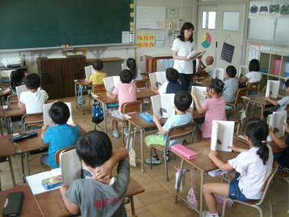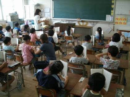 国語科学習の様子です。先生の範読を聞きながら、聞き取りの学習をしています。