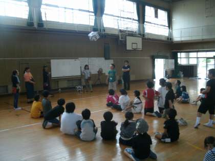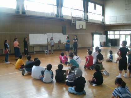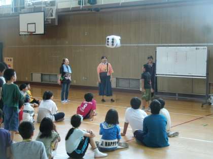 ゲーム大会が始まりました。大きなサイコロを投げて、グループ対抗で得点を競います。