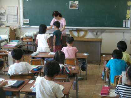 昨日に先生が回収し、○つけをした計算ドリルを子ども達が分担して配っています。間違った答えがあった時はそこに付箋が貼られています。子ども達はその問題についてやり直しをし、先生の所へ持っていきます。そこで○がつけば合格です。間違いをそのままにしないで、やり直すということが大切です。