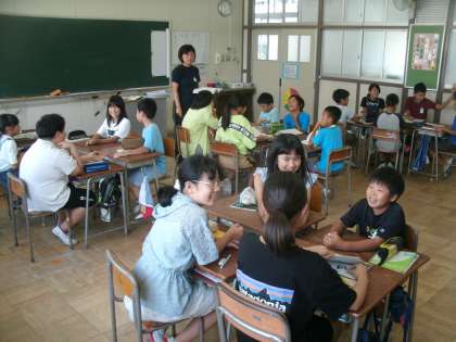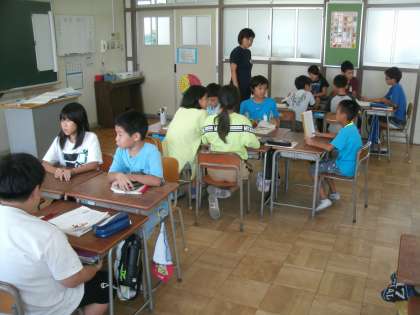 国語科学習の様子です。「自分の立場を決めて、討論をしよう」という学習です。「シャープペンシルを使うべきである」「エアコンの設定温度は私たちで決めるべきである」ということについて賛成・反対の立場を決めた上、その理由をしっかりノートに書いて、同意見の友だちと討論に向けての話し合いをしています。反対意見のグループに負けないように同意見の仲間と力を合わせ、しっかり理論構築していきます。