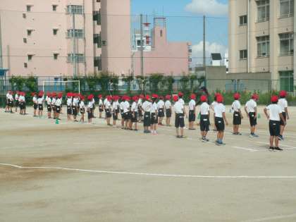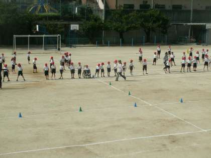 1時間目に1・2年生が運動場で隊形移動の練習をしていました。今日も暑くなりそうなので、気温があまり上がらないうちに練習ですね。低学年にとって隊形移動はとても難しいことです。高学年なら図面上でもシュミレーションできるのですが、低学年は実際の場所でないとなかなかうまくいかないようです。