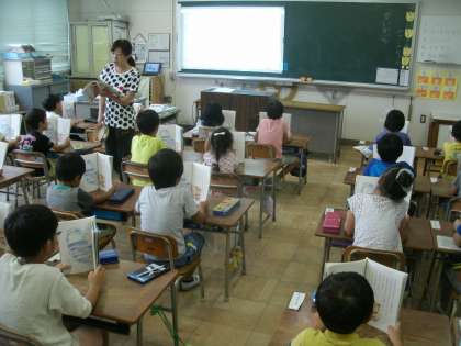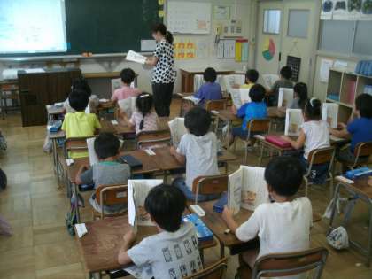 全員で教材文「かいがら」を音読しています。先生が音楽の時間でもないのにタンバリンを持っています。なぜでしょう?全員で声を揃えて音読するために、「、」は一つ、「。」は二つ、タンバリンを叩いて、間隔のリズムをとっているのです。子ども達が家で音読するときも、読点・句読点で軽く手を叩いていただければと思います。