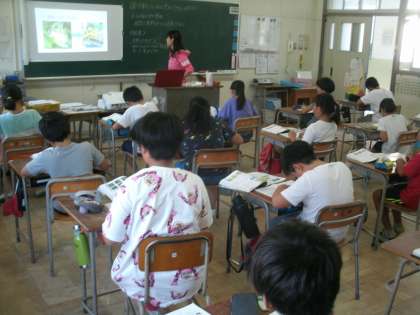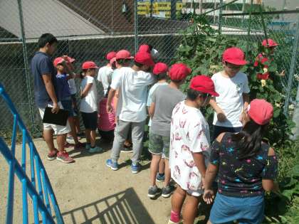 理科学習の様子です。学習課題は「受粉しなければ実はできないのだろうか。」です。みんなで学習園に行って、オモチャカボチャを観察し、実際に確かめていました。