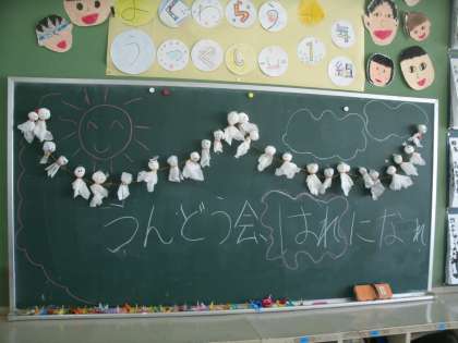 4年生の教室の後ろの黒板にたくさんのテルテル坊主と子ども達の願いがありました。少し天気が心配な29日の運動会。子ども達の願いが天に通じてくれるといいですね。