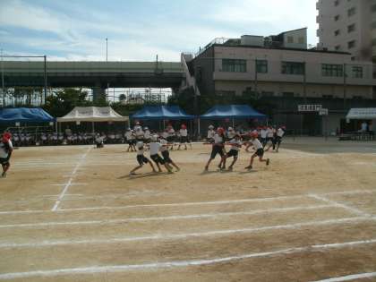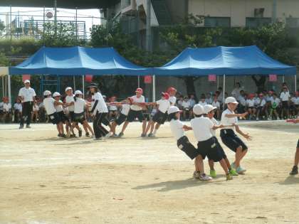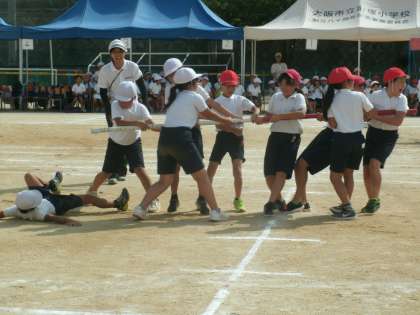 4年生の団体競技「令和最初の棒引き」の様子です。最後の赤白対抗の得点競技です。これで総合優勝が決まります。