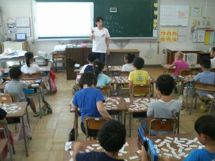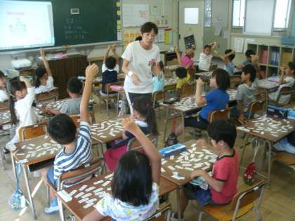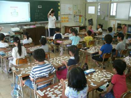 算数科学習の様子です。机の上に計算カードを広げて、先生の言った答えになるカードを見つけていきます。ゲーム化されているので、子ども達は一生懸命にカードを探しています。