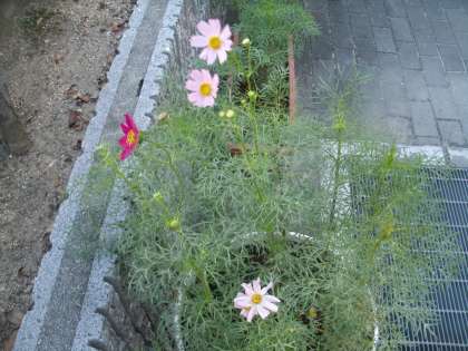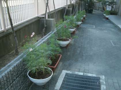 管理作業員の畠山さんがバックヤードで育ててくださっていたコスモスを正門付近に出しました。コスモスは「秋桜」と書くように、秋の代表的な花の一つです。秋の風に揺れるコスモスの花はきっと子ども達の心を優しくしてくれると思います。まだちらほら咲きですが、2週間もすればたくさんのコスモスの花が私たちの目を楽しませてくれるはずです。
