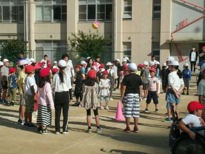 木曜日は児童集会の日です。わくわくグループでゲームを楽しみます。今日は「キャッチゲーム」です。グループで円になって、1・2・3年生が赤、4・5・6年生が白に帽子の色を変えてゲームがスタートです。赤は白、白は赤にしかボールを投げれません。20回キャッチができたら、その場に座ります。高学年は低学年がキャッチしやすいようにフワッとした優しいボールを投げていますよ。