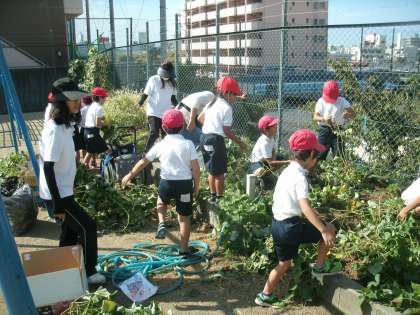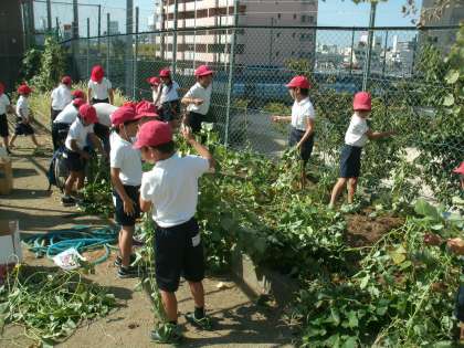 みんなでおいもほりをしました。茂ったおいものつるをとってから、スコップを使って掘り出しました。大きいおいもが出てくるたびに子ども達は大歓声を上げていました。思いのほかたくさん収穫できたので子ども達は大喜びでした。