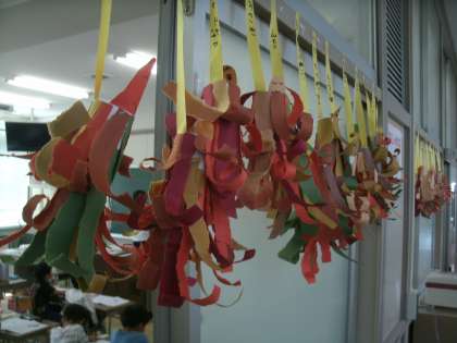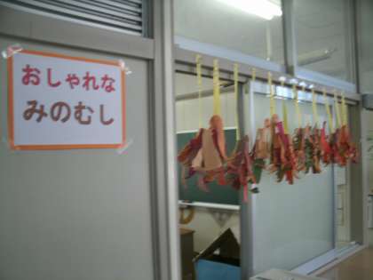1年生教室の靴箱の上に子ども達が作った「おしゃれなみのむし」がたくさんぶら下がっていました。