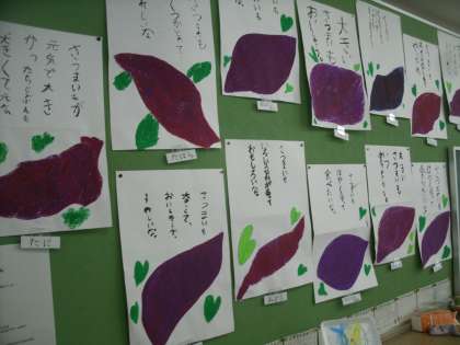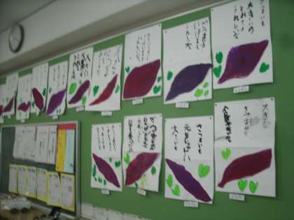 2年生の教室の後ろに大きくておいしそうなサツマイモの絵がたくさん掲示されました。子ども達のかわいい一言もそえてあります。