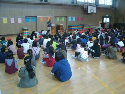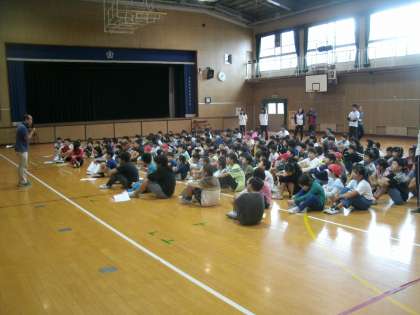 今日の児童集会は明日の全校遠足に向けてのオリエンテーションでした。雨が少しでも早く上がってほしいですね。