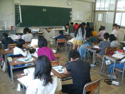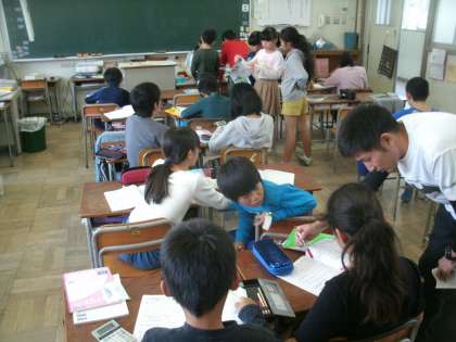 算数科学習の様子です。学習したことを練習問題で確かめています。T1が子ども達のドリルに○をつけ、T2が考えている子どもを支援しています。