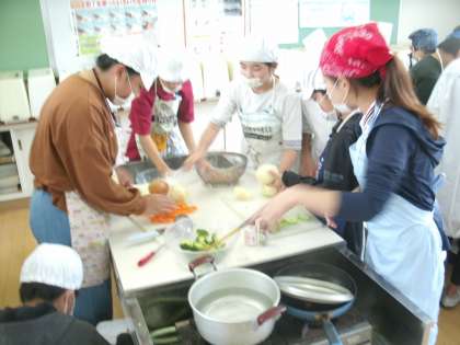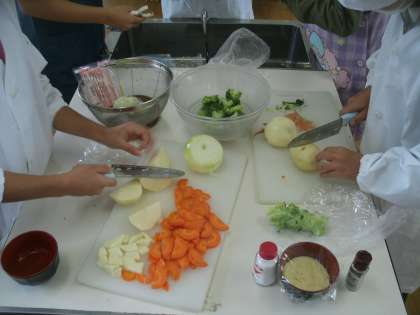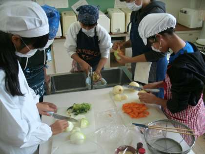 家庭科学習で調理実習に取り組みました。今日の献立は「ジャーマンポテト」です。じゃがいも・にんじん・たまねぎ・ブロッコリー・ベーコンを切っています。