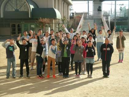 卒業アルバムの撮影をしてもらいました。カメラマンが3階から俯瞰で子ども達を撮影しています。私はその様子を1階で撮影しました。