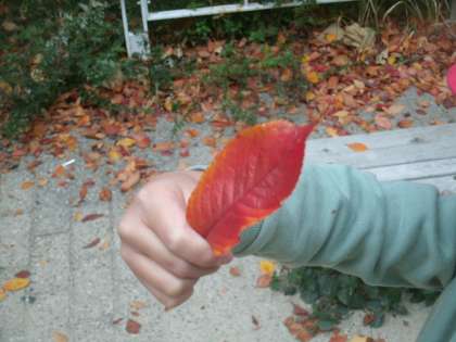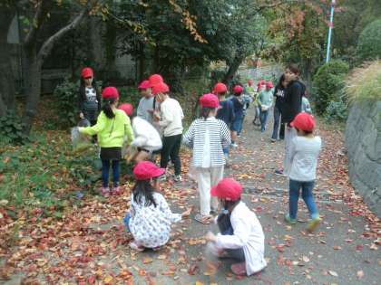 学校の前の公園に出かけて、落ち葉をたくさん拾いました。面白い形の落ち葉やきれいな色の落ち葉をたくさん見つけました。風が吹いて落ち葉がはらはらと落ちてくる度に歓声が上がりました。