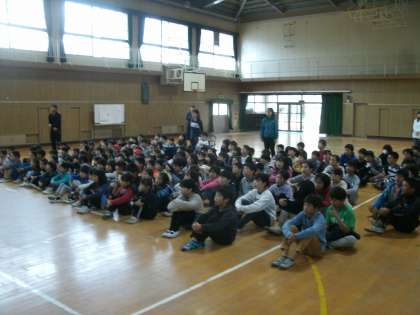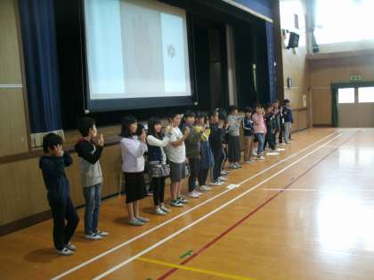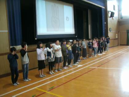 木曜日は児童集会の日です。今日は体育館で4年生が「指文字」を発表してくれました。