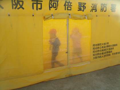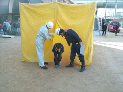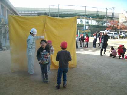 煙幕テントの様子です。煙(無害の煙です。子ども達はシュークリームの甘いにおいがすると言っていました。)で見えない中、姿勢を低くして、壁を伝いながら通り抜ける体験をしました。
