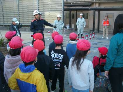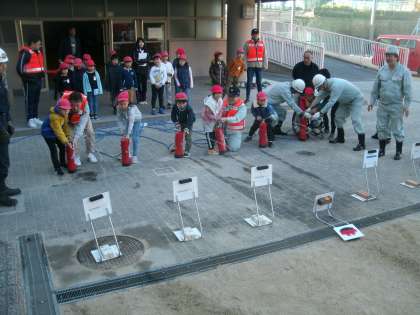 水消火器での消火訓練の様子です。うまく的に当てて、消火することができるかな。