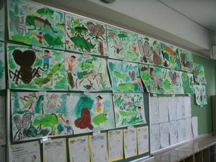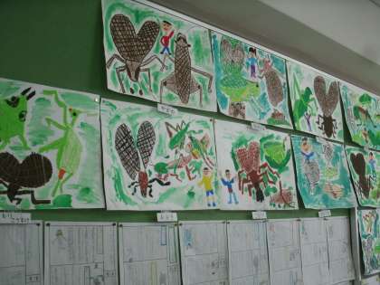 教室の後ろに貼られている子ども達の作品を紹介します。鈴虫やコオロギなどが大きく描かれています。